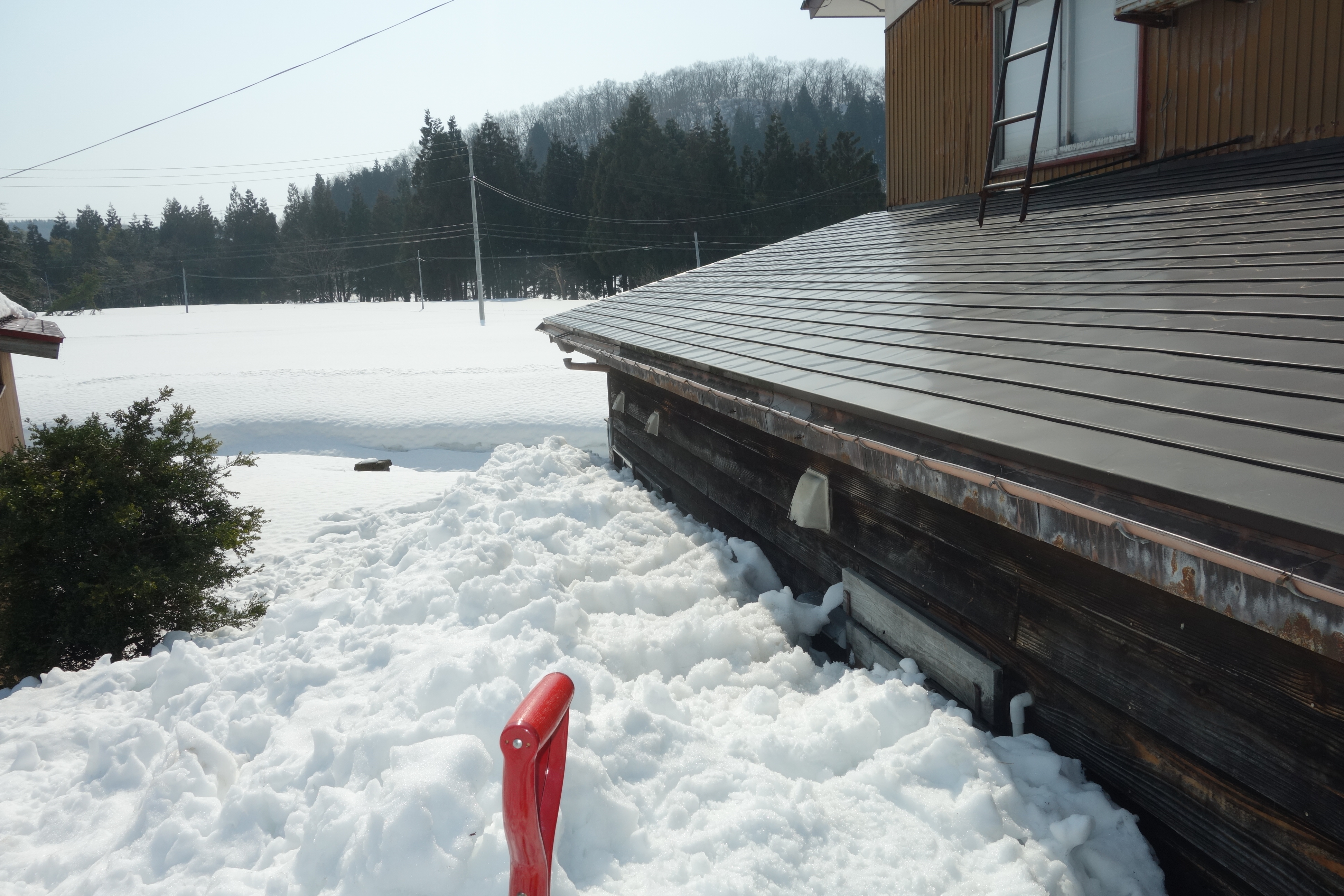 このままでは雪が被っている部分の軒が折れてしまうので、とりあえず落雪と屋根が繋がっているところの雪を排しました。